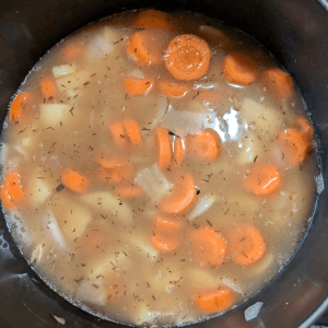 (Add the water and the vegetables.)